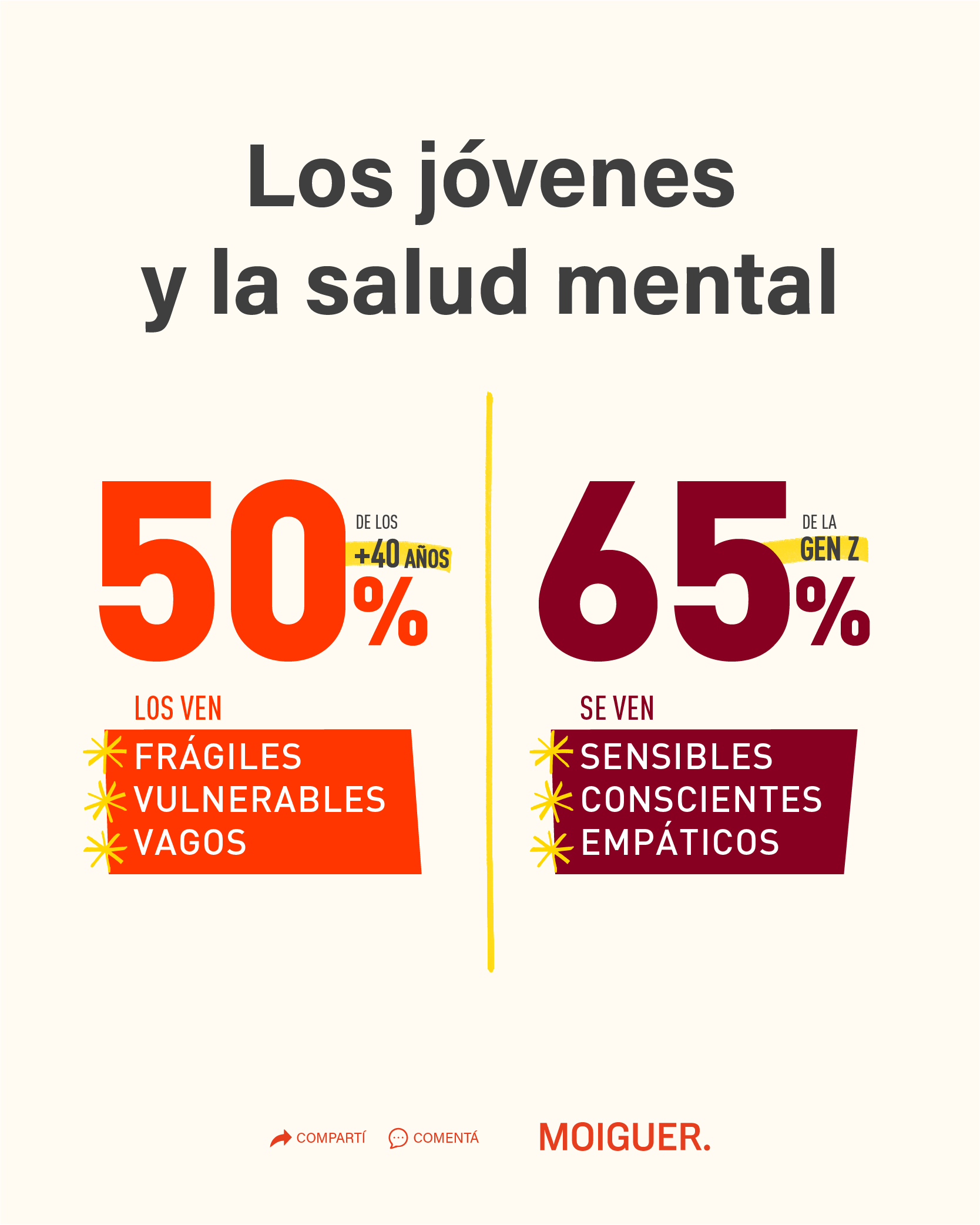 Hoy, el 65% de la Generación Z se autopercibe como “sensible y empático”, mientras el 50% de las personas con más de 40 años que fueron encuestadas los tilda de “vagos y frágiles”. La mayoría de los jóvenes de entre 15 y 25 años declara que tienen más registro de sus necesidades emocionales y sabe cómo expresarlas. Se definen como “emocionalmente conscientes”, pero para los ojos de los adultos se trata de personas vulnerables.